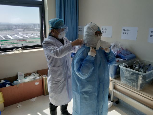 首先是防護裝備。進隔離病房一般是三級防護,除穿戴防護服、隔離衣、護目鏡、N95口罩、兩層手套,兩層腳套外,還要戴正壓防護頭套或一次性全面型防護頭套。此外,頭套還帶有新風過濾系統。整套防護裝備,凌肯在老師的幫助下,花了半個小時才穿上。穿戴完畢,凌肯整個人都很難受。護目鏡起霧,頭套風機發出巨大噪音,還有悶熱,整個人都變得遲鈍。