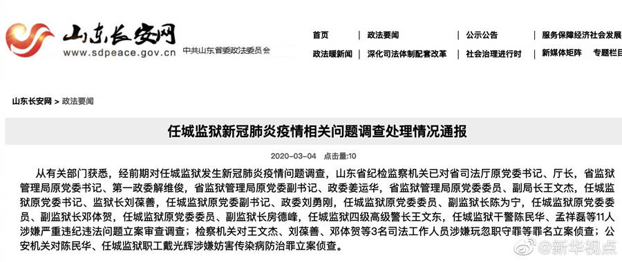 山東任城監獄新冠肺炎疫情相關問題調查處理情況通報-新華網