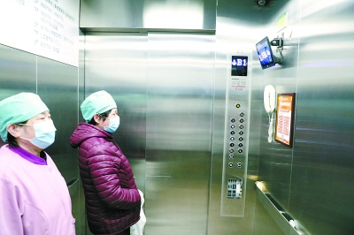昨天,在海淀醫院,醫務人員搭乘語音電梯。 記者 饒強攝