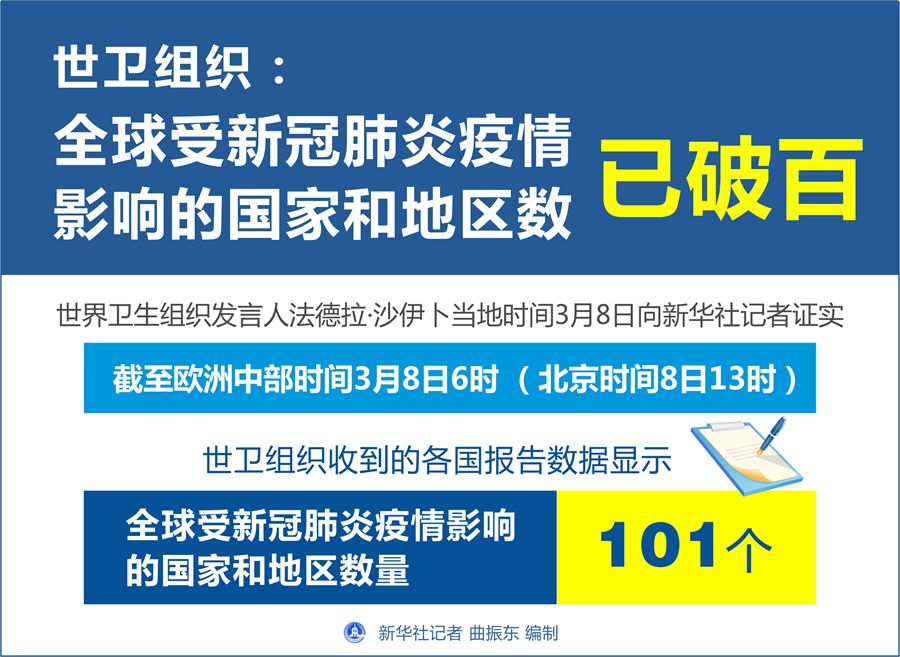 新華社日內瓦3月8日電(記者劉曲 陳俊俠 沈忠浩)世界衛生組織發言人法德拉·沙伊卜8日向新華社記者證實,截至歐洲中部時間8日6時(北京時間8日13時),世衛組織收到的各國報告數據顯示,全球受新冠肺炎疫情影響的國家和地區數量已達101個。