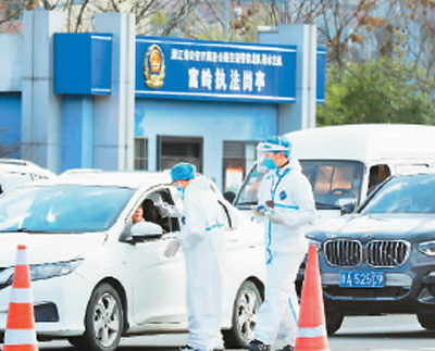 醫(yī)護(hù)人員在浙江省麗水市麗龍高速公路富嶺收費(fèi)站出口為來往人員測體溫。陳英亞攝
