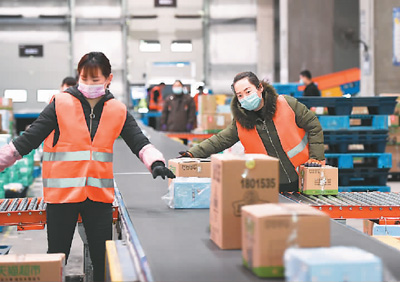近日,位于北京市順義區(qū)的菜鳥(niǎo)物流倉(cāng)庫(kù)在做好疫情防控的同時(shí),穩(wěn)步有序復(fù)工復(fù)產(chǎn)。該物流倉(cāng)庫(kù)目前每天處理訂單近5萬(wàn)件,生產(chǎn)運(yùn)營(yíng)基本恢復(fù)到日常水平。圖為3月12日,在順義區(qū)菜鳥(niǎo)物流倉(cāng)庫(kù),幾名員工在分揀打包的商品。