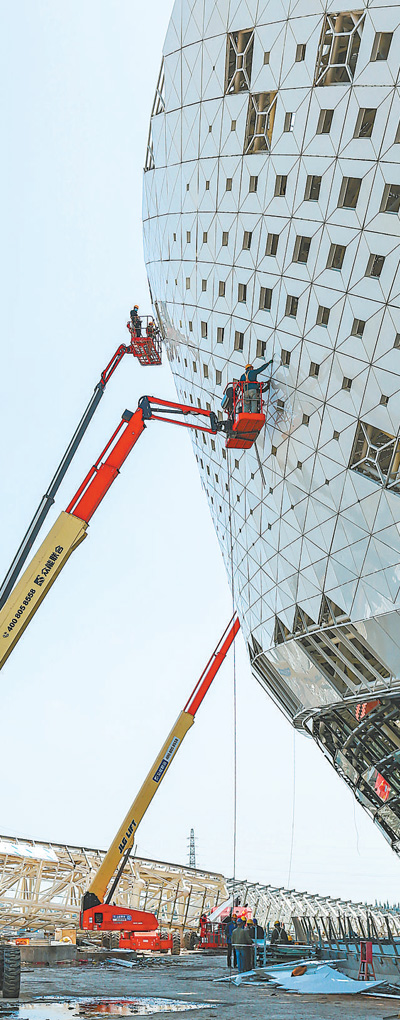 3月15日,第十八屆世界中學(xué)生運動會主會場福建晉江市第二體育中心各個場館及室外工程均已全部復(fù)工。圖為工人在進行主場館外立面施工。邵玉姿 董嚴(yán)軍攝影報道