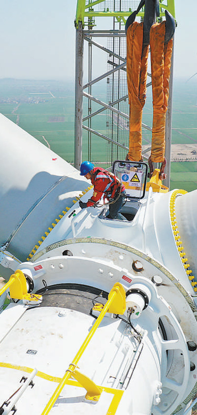 3月15日,在安徽省亳州市蒙城縣,華能風(fēng)電項目復(fù)工后的第七臺風(fēng)機順利吊裝。胡衛(wèi)國攝(影像中國)