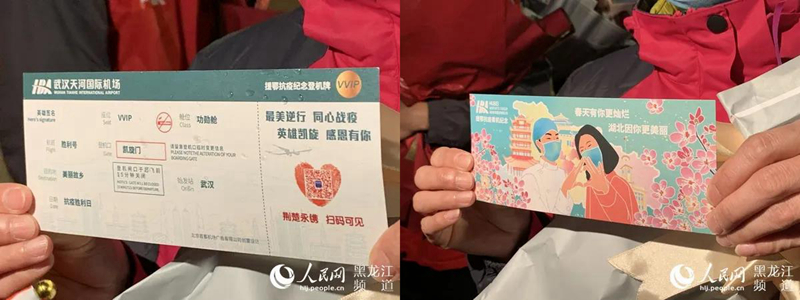 公寶霞是黑龍江省第五批援鄂醫療隊隊員,作為首批凱旋回鄉的醫護人員,她格外興奮?!澳康牡貙懼利惖墓枢l’,航班號是‘勝利號’,艙位是‘功勛艙’?!惫珜毾颊f,這是武漢天河機場專門為他們準備的紀念登機牌,特別有意義。