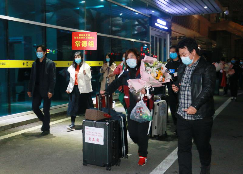 飛機落地后,走出艙門的醫護人員受到了家鄉人民的熱烈歡迎?!白叱雠撻T的第一感覺是回家真好!我是第二個出艙的,一下飛機就看到醫院的領導和同事們來接我們回家,心里特別溫暖,特別的感動。現在最想做的,是結束隔離后回家看看親人,然后徹底地放松一下?!蹦喜髮W二附院呼吸與危重癥醫學科副主任護師余嬌說,“雖然我們回來了,但武漢還有我們的隊友,希望他們早日平安歸來。