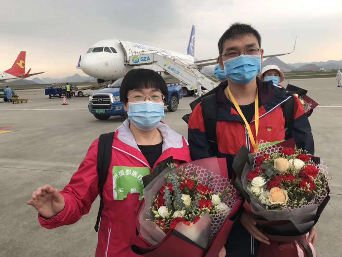 貴州省援鄂醫療隊隊員王艷(左一)平安返黔。開陽宣傳部供圖