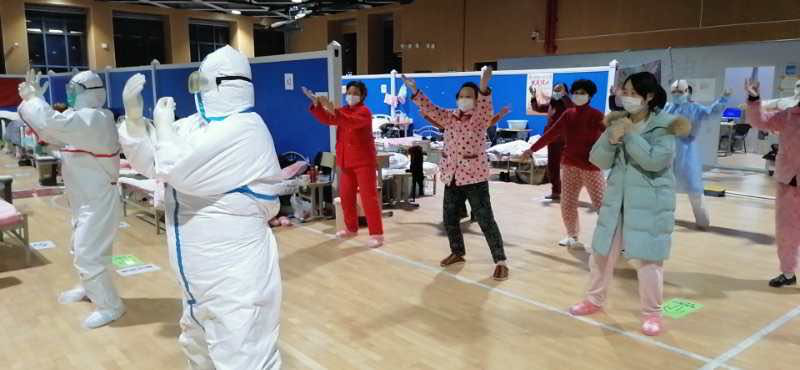 青海醫護人員帶領患者們一起做運動。青海省支援湖北護理醫療隊供圖