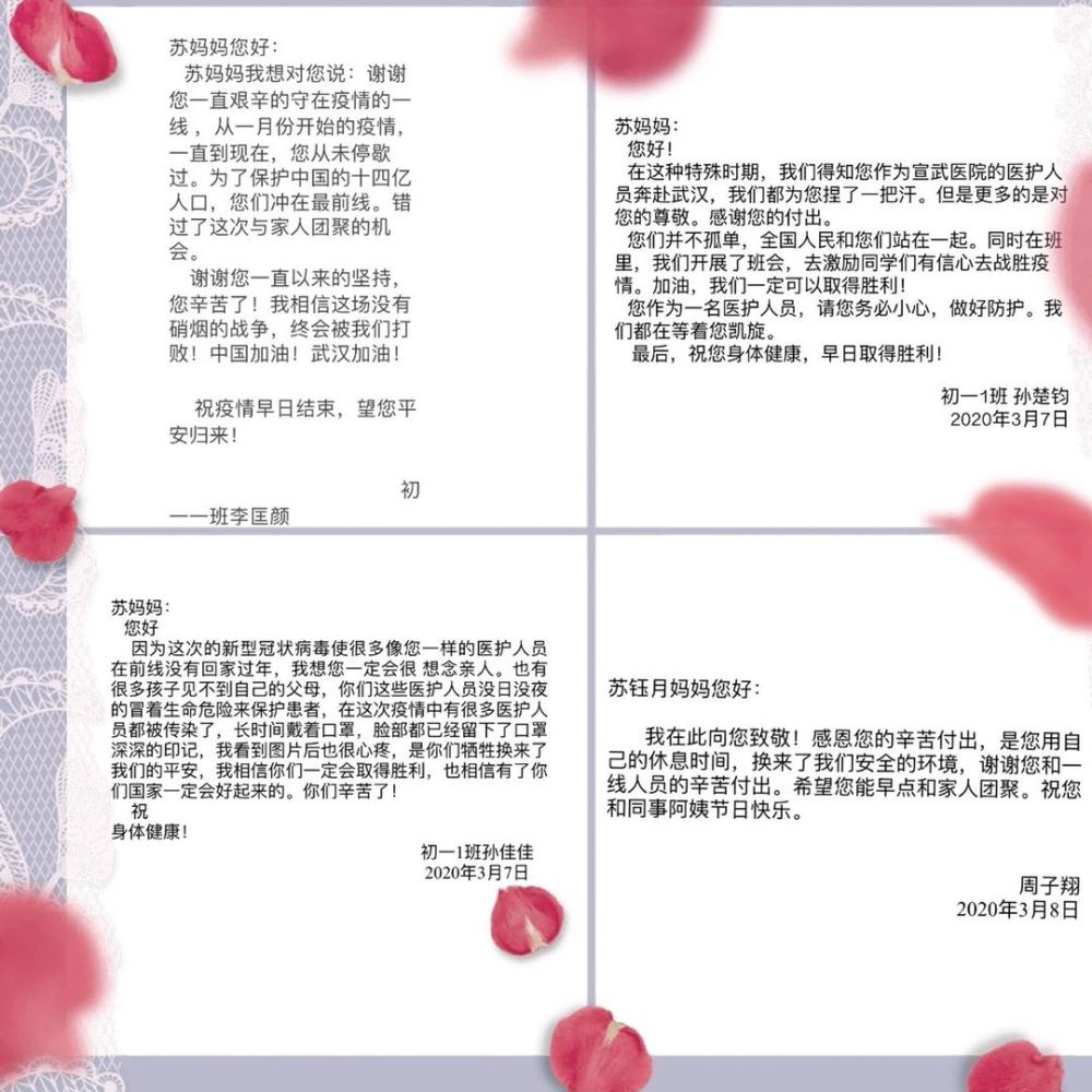 這些孩子們不曾來(lái)到武漢,但是他們的來(lái)信,對(duì)我來(lái)說(shuō)都是一種鼓勵(lì),是我前行的動(dòng)力。其實(shí)在這場(chǎng)戰(zhàn)“疫”中,他們的父母也都和我一樣,在默默地為大家做著自己能做到的一切。他們或許是教師、是警察,或許是公司的普通職員,但他們也都在自己所從事的行業(yè)里、在自己的崗位上堅(jiān)守著。