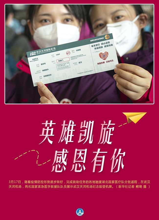 登機口是“凱旋門”,航班號是“勝利號”,艙位是“功勛艙”,旅客姓名是英雄簽名,一張精心制作的援鄂抗疫登機紀(jì)念牌,成為援鄂醫(yī)療隊員們“最美的紀(jì)念”。