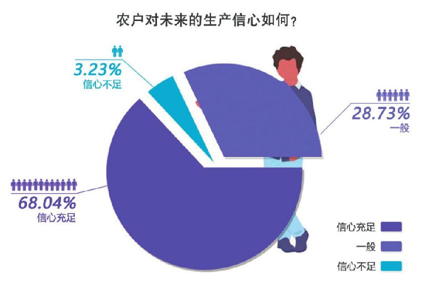 問卷調(diào)查顯示,68.04%的農(nóng)戶表示對糧食生產(chǎn)未來“信心充足”,28.73%的農(nóng)戶表示“信心一般”,信心不足的僅占3.23%。(見圖2)