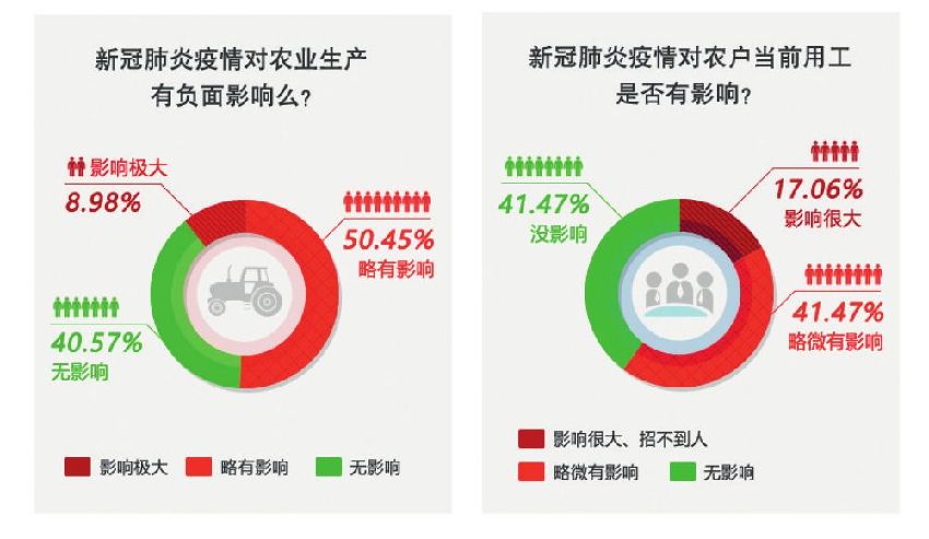 557份有效問卷數(shù)據(jù)顯示,8.98%的農(nóng)戶認(rèn)為疫情對農(nóng)業(yè)生產(chǎn)負(fù)面影響極大,50.45%的農(nóng)戶認(rèn)為略有影響。在疫情對用工影響上,17.06%的農(nóng)戶反映影響大、招不到人,41.47%的農(nóng)戶認(rèn)為略微有影響。(見圖1)