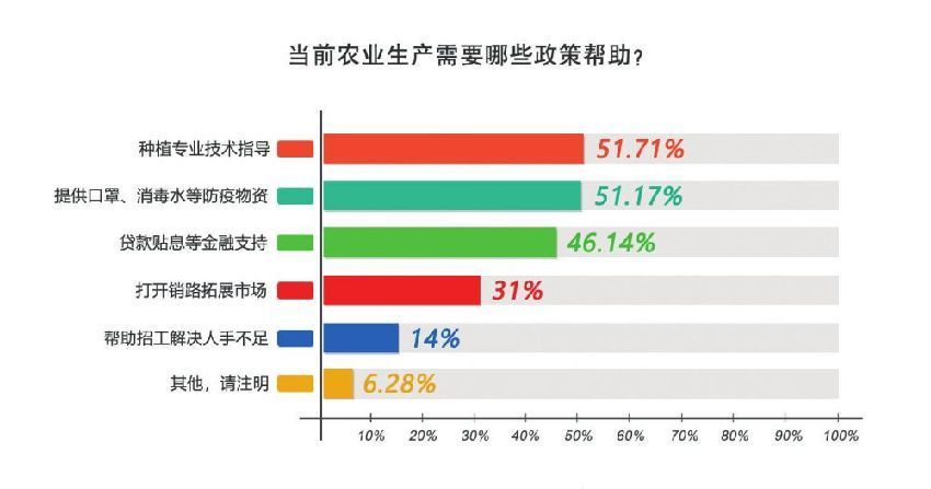 加強(qiáng)農(nóng)技指導(dǎo),給予金融支持。問卷調(diào)查中農(nóng)戶提出多項(xiàng)政策需求,51.71%的農(nóng)戶希望得到種植專業(yè)技術(shù)指導(dǎo),51.17%的農(nóng)戶呼吁提供口罩、消毒液等防疫物資,46.14%的農(nóng)戶則希望得到貸款貼息等金融扶持。(見圖4)