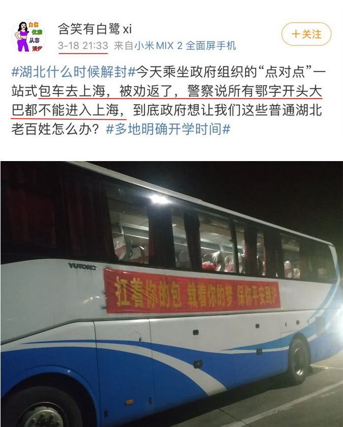 有媒體報道稱,3月18日至3月19日,多個湖北縣市的點(diǎn)對點(diǎn)大巴包車,到達(dá)上海市附近高速收費(fèi)站或高速公路后,遭遇無法進(jìn)入上海的囧境。不少返程復(fù)工人員為此等待至深夜,甚至只能在大巴車中過夜。