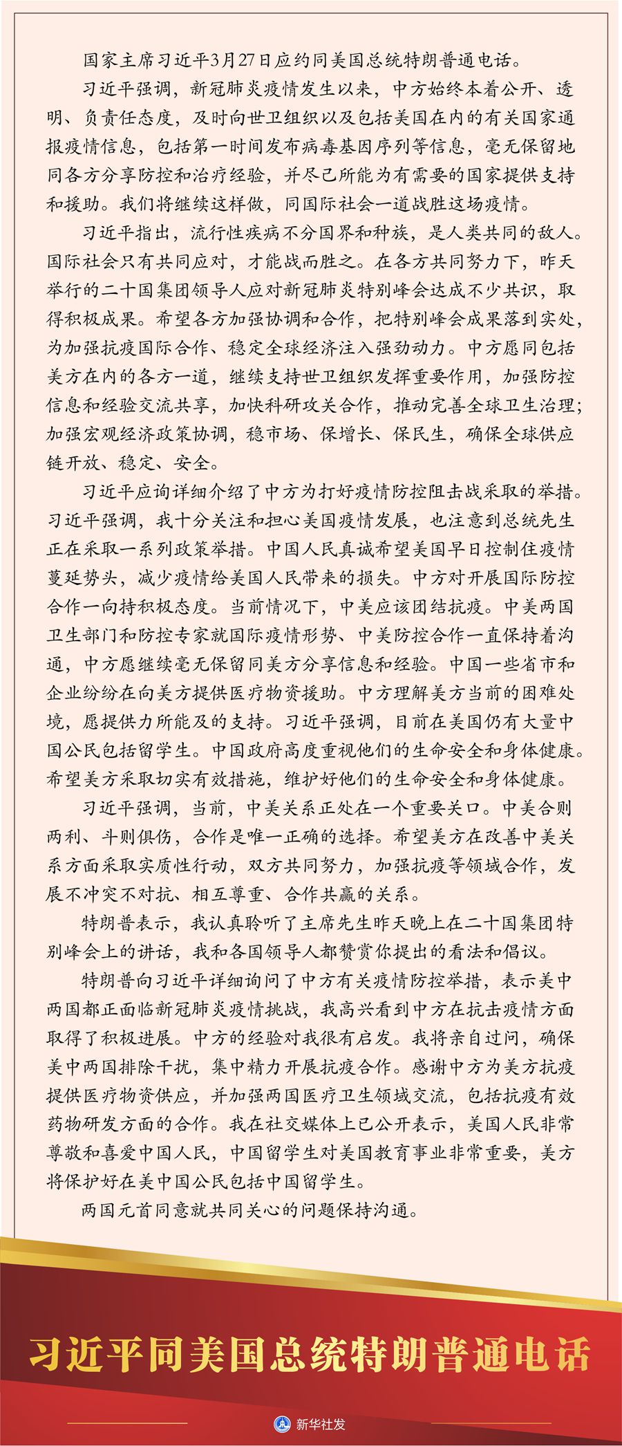 特朗普向習近平詳細詢問了中方有關疫情防控舉措,表示美中兩國都正面臨新冠肺炎疫情挑戰,我高興看到中方在抗擊疫情方面取得了積極進展。中方的經驗對我很有啟發。我將親自過問,確保美中兩國排除干擾,集中精力開展抗疫合作。感謝中方為美方抗疫提供醫療物資供應,并加強兩國醫療衛生領域交流,包括抗疫有效藥物研發方面的合作。我在社交媒體上已公開表示,美國人民非常尊敬和喜愛中國人民,中國留學生對美國教育事業非常重要,美方將保護好在美中國公民包括中國留學生。