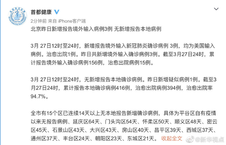北京27日新增報(bào)告境外輸入病例3例 無新增報(bào)告本地病例-新華網(wǎng)