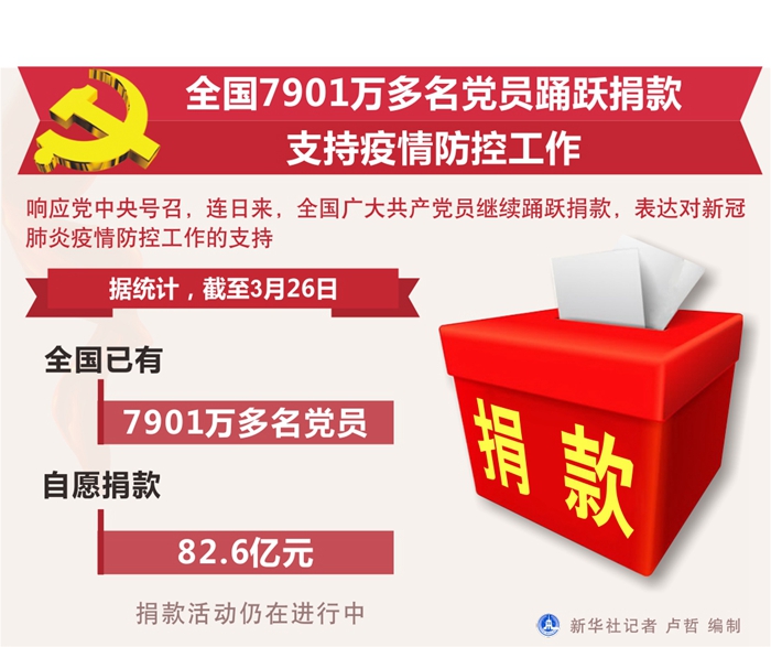 新華社北京3月28日電 響應黨中央號召,連日來,全國廣大共產黨員繼續踴躍捐款,表達對新冠肺炎疫情防控工作的支持。據統計,截至3月26日,全國已有7901萬多名黨員自愿捐款82.6億元。捐款活動仍在進行中。