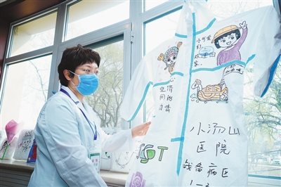 醫(yī)護(hù)人員展示防護(hù)服上的涂鴉作品。為減輕待篩查人員緊張心理,幫助確診患者樹(shù)立戰(zhàn)勝疾病的信心,醫(yī)院在籌建之初,就將心理干預(yù)納入其中,發(fā)起組織病區(qū)環(huán)境布置、背包設(shè)計(jì)、折紙比賽、八段錦訓(xùn)練等活動(dòng),營(yíng)造“家”的氛圍。記者 賀 勇攝