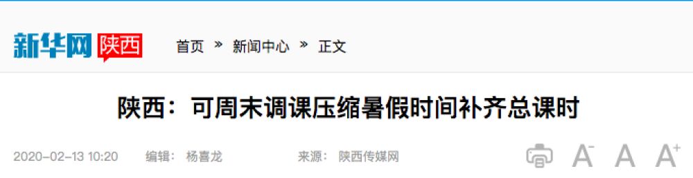 2月11日,陜西省新型冠狀病毒感染的肺炎疫情防控工作情況第十場新聞發布會上,陜西教育系統新冠肺炎疫情防控工作領導小組常務副組長、省委教育工委委員、省教育廳副廳長趙昶葆表示,“各地各校后續可采取周末調課、壓縮暑假時間等方式補齊總課時。”