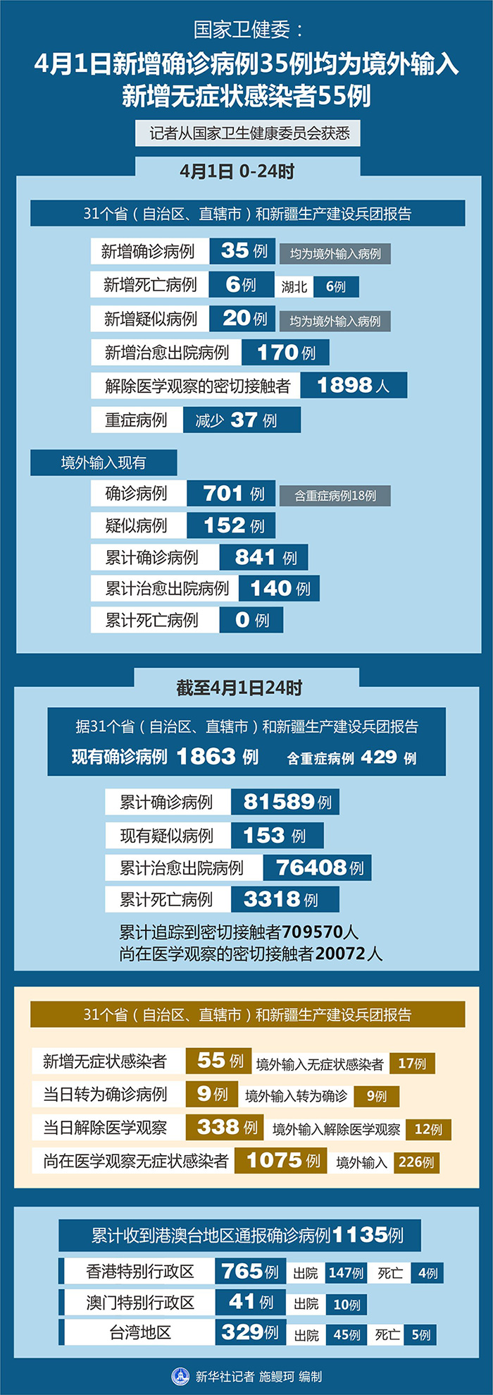 截至4月1日24時(shí),據(jù)31個(gè)省(自治區(qū)、直轄市)和新疆生產(chǎn)建設(shè)兵團(tuán)報(bào)告,現(xiàn)有確診病例1863例(含重癥病例429例),現(xiàn)有疑似病例153例。累計(jì)確診病例81589例,累計(jì)治愈出院病例76408例,累計(jì)死亡病例3318例,累計(jì)追蹤到密切接觸者709570人,尚在醫(yī)學(xué)觀察的密切接觸者20072人。