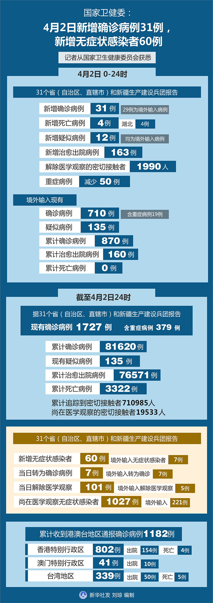 截至4月2日24時,據31個?。ㄗ灾螀^、直轄市)和新疆生產建設兵團報告,現有確診病例1727例(其中重癥病例379例),累計治愈出院病例76571例,累計死亡病例3322例,累計報告確診病例81620例,現有疑似病例135例。累計追蹤到密切接觸者710985人,尚在醫學觀察的密切接觸者19533人。