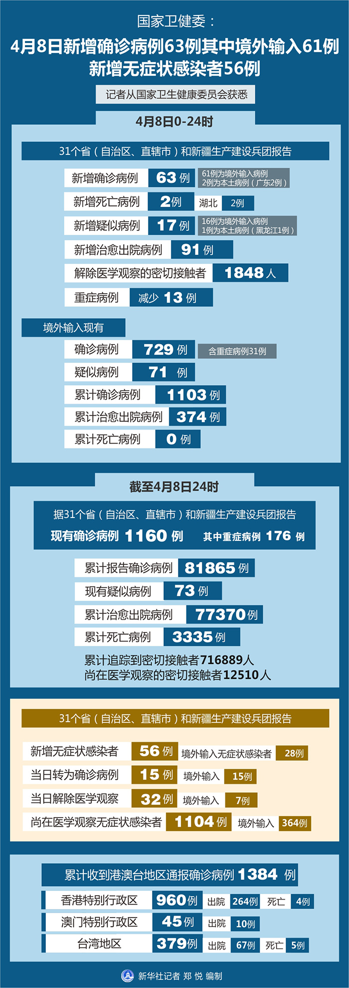截至4月8日24時,據31個省(自治區、直轄市)和新疆生產建設兵團報告,現有確診病例1160例(其中重癥病例176例),累計治愈出院病例77370例,累計死亡病例3335例,累計報告確診病例81865例,現有疑似病例73例。累計追蹤到密切接觸者716889人,尚在醫學觀察的密切接觸者12510人。