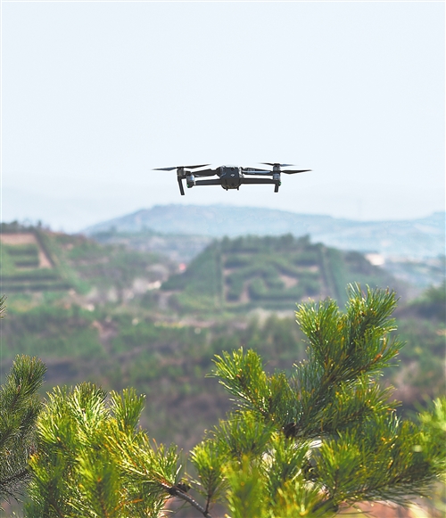 無人機在山西太原杏花嶺區牛駝生態林區護林防火巡查。 新華社發