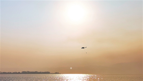 為撲救四川西昌森林火災,救援直升機在西昌邛海取水。 新華社發