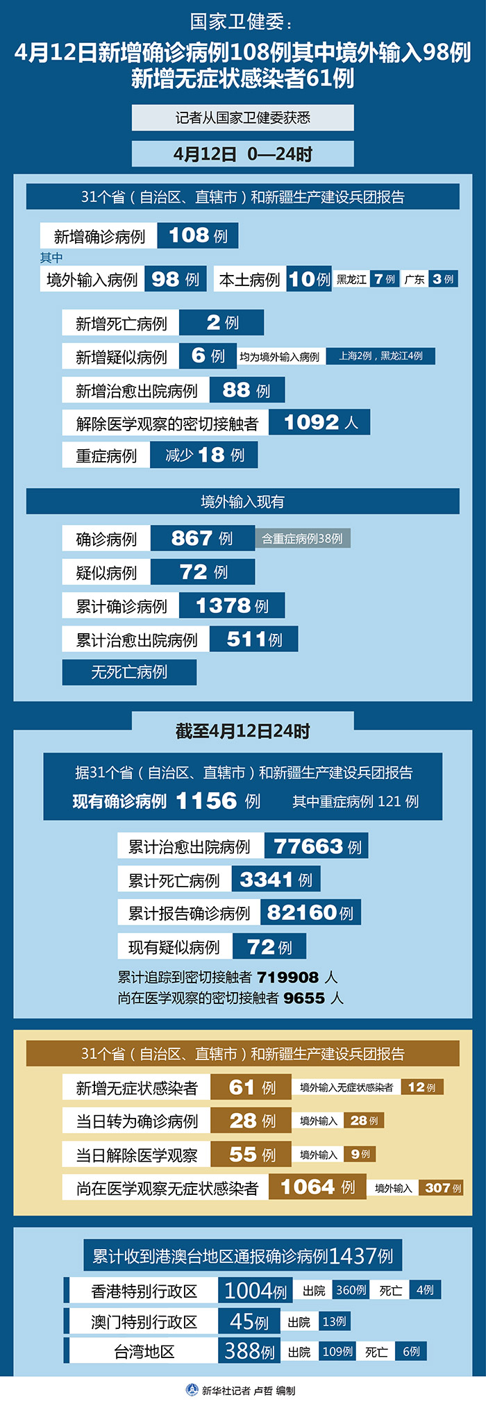 新華社北京4月13日電(記者王鵬、朱超)國家衛(wèi)健委13日通報,4月12日0-24時,31個省(自治區(qū)、直轄市)和新疆生產(chǎn)建設(shè)兵團報告新增確診病例108例,其中98例為境外輸入病例,10例為本土病例(黑龍江7例,廣東3例);新增死亡病例2例(湖北2例);新增疑似病例6例,均為境外輸入病例(黑龍江4例,上海2例)。