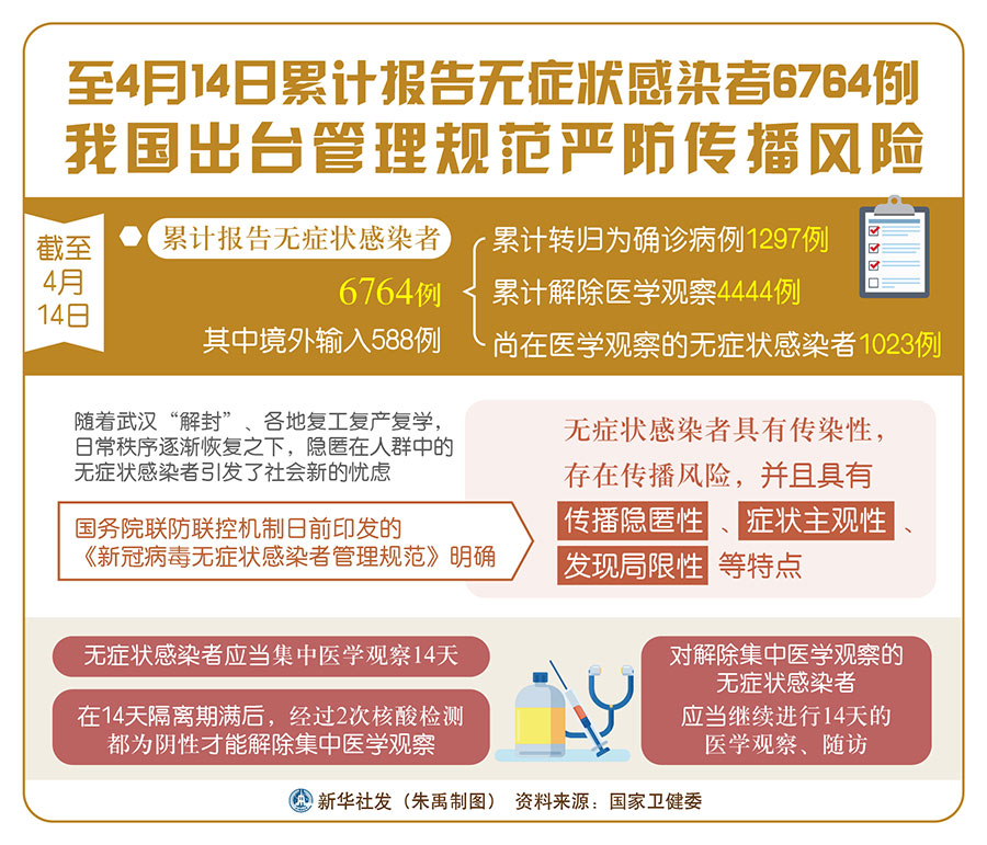 新華社北京4月15日電(記者溫競(jìng)?cè)A、郁瓊源)記者從國(guó)家衛(wèi)健委獲悉,截至4月14日,累計(jì)報(bào)告無癥狀感染者6764例,其中境外輸入588例;累計(jì)轉(zhuǎn)歸為確診病例1297例,累計(jì)解除醫(yī)學(xué)觀察4444例,尚在醫(yī)學(xué)觀察的無癥狀感染者1023例。