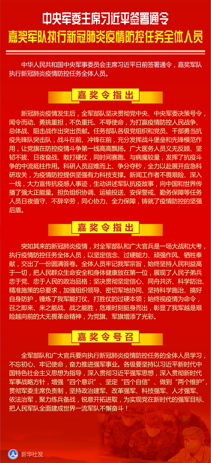 嘉獎(jiǎng)令指出,突如其來的新冠肺炎疫情,對(duì)全軍部隊(duì)和廣大官兵是一場(chǎng)大戰(zhàn)和大考,執(zhí)行疫情防控任務(wù)全體人員,以堅(jiān)定信念、過硬能力、頑強(qiáng)作風(fēng)、犧牲奉獻(xiàn),交出了一份圓滿答卷。全體人員牢記我軍宗旨,始終堅(jiān)持人民利益高于一切,把人民群眾生命安全和身體健康放在第一位,展現(xiàn)了人民子弟兵忠于黨、忠于人民的政治品格;堅(jiān)決貫徹堅(jiān)定信心、同舟共濟(jì)、科學(xué)防治、精準(zhǔn)施策的總要求,加強(qiáng)組織領(lǐng)導(dǎo)、密切軍地協(xié)同、堅(jiān)持科學(xué)施治、搞好自身防護(hù),錘煉了我軍能打仗、打勝仗的過硬本領(lǐng);始終視疫情為命令,召之即來、來之能戰(zhàn)、戰(zhàn)之能勝,危難時(shí)刻挺身而出,彰顯了我軍越是艱險(xiǎn)越向前的大無畏革命精神,為黨旗、軍旗增添了光彩。