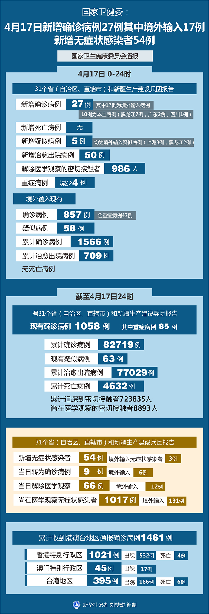 截至4月17日24時(shí),據(jù)31個(gè)省(自治區(qū)、直轄市)和新疆生產(chǎn)建設(shè)兵團(tuán)報(bào)告,現(xiàn)有確診病例1058例(其中重癥病例85例),累計(jì)治愈出院病例77029例,累計(jì)死亡病例4632例,累計(jì)報(bào)告確診病例82719例,現(xiàn)有疑似病例63例。累計(jì)追蹤到密切接觸者723835人,尚在醫(yī)學(xué)觀察的密切接觸者8893人。