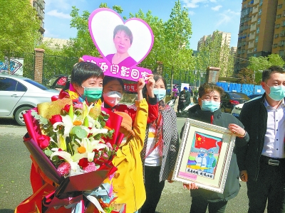 昨天,石景山區古城街道老古城西社區歡迎援鄂醫護人員閆影平安凱旋。古城村秉心圣會腰鼓隊和太平鼓隊的鼓手用鼓聲歡慶英雄凱旋,社區巧娘們還親手折了60只千紙鶴做成項鏈表達敬意。本報記者 吳鏑攝