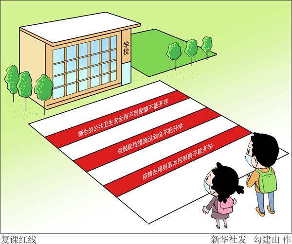 答:有3條紅線:疫情沒得到基本控制前不能開學,校園防控措施沒到位不能開學,師生的公共衛生安全得不到保障不能開學。在逐步恢復教育教學正常秩序的過程中,需要不斷調整、不斷總結。這個過程不能“一刀切”,廣大師生的健康安全是第一位的,要根據各地各校能夠提供的疫情防控條件來決定,否則寧愿往后推遲開學復課時間。