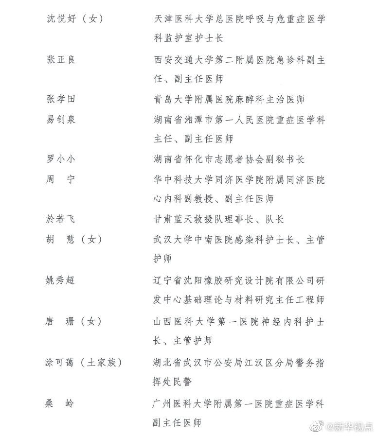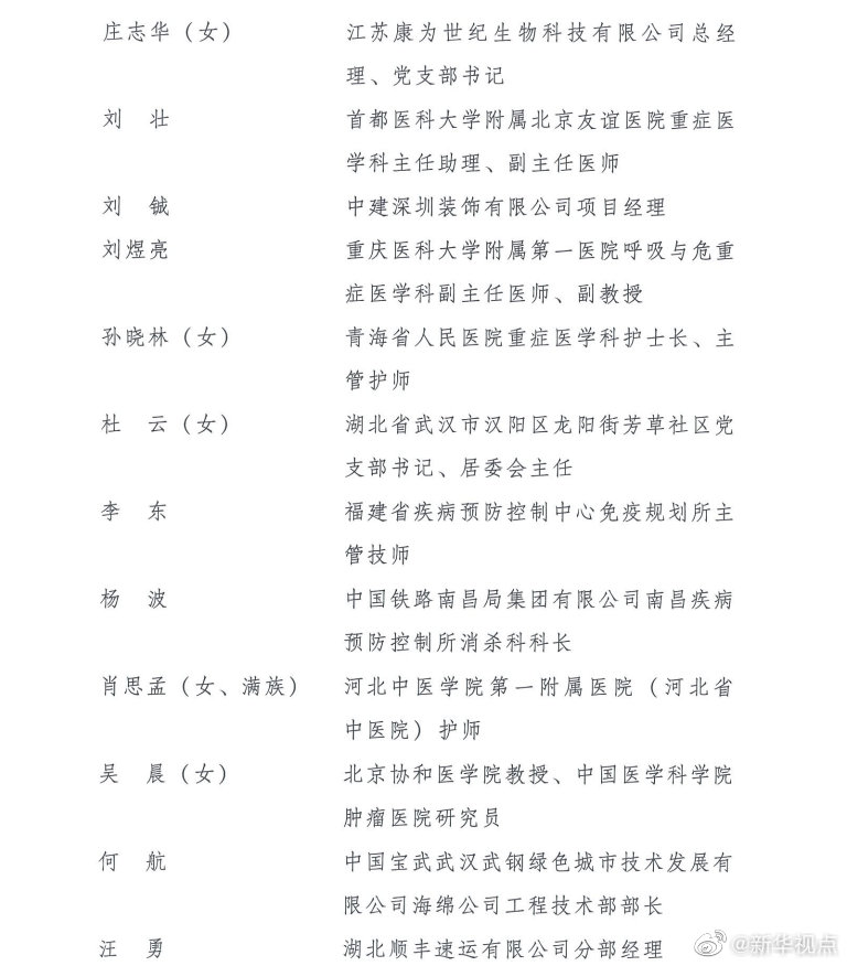 榮獲第24屆“中國青年五四獎?wù)隆钡姆謩e是:江蘇省南京市鼓樓區(qū)方家營消防救援站站長助理、三級消防長丁良浩,安徽省滁州市定遠(yuǎn)縣吳圩鎮(zhèn)西孔村黨總支第一書記王萌萌(女),廈門大學(xué)航空航天學(xué)院常務(wù)副院長、特聘教授、博士生導(dǎo)師尤延鋮,湖北省黃岡市羅田縣希望小學(xué)校長方榮(女),浙江每日互動網(wǎng)絡(luò)科技股份有限公司董事長兼總經(jīng)理、黨委書記方毅,浙江省杭州市拱墅區(qū)職業(yè)高級中學(xué)美發(fā)專業(yè)教師石丹(女),國家超級計算無錫中心副主任付昊桓,中國石油大港油田公司第二采油廠作業(yè)二區(qū)注采二組副組長馮萌萌(女),寧夏回族自治區(qū)石嘴山市中醫(yī)醫(yī)院副主任醫(yī)師朱斌,中國國家女子排球隊隊員、隊長朱婷(女),95072部隊參謀部訓(xùn)練處正團(tuán)職飛行技術(shù)檢查主任劉飛,廣西壯族自治區(qū)玉林市博白縣桂源農(nóng)牧有限公司總經(jīng)理劉入源,貴州省黔西南州望謨縣實(shí)驗(yàn)高中黨總支副書記、副校長劉秀祥,哈爾濱工業(yè)大學(xué)體育部副教授張虹(女),遼寧省沈陽造幣有限公司鉗工高級技師、維修班班長張文良(滿族),北京市朝陽區(qū)青少年指導(dǎo)服務(wù)中心主任張曉菲(女),吉林省超凡夢想公益基金會理事長張超凡(女),中國科學(xué)院計算技術(shù)研究所所長助理、研究員、博士生導(dǎo)師陳云霽,武警部隊某部特戰(zhàn)訓(xùn)練大隊代理大隊長陳玉浩,中山大學(xué)中山眼科中心副主任、研究員林浩添,四川省廣元市青川縣恒豐食用菌種植專業(yè)合作社理事長、青川海伶山珍商貿(mào)有限責(zé)任公司總經(jīng)理趙海伶(女),航空工業(yè)哈爾濱飛機(jī)工業(yè)集團(tuán)有限公司數(shù)控銑工秦世俊,92950部隊飛行一大隊大隊長袁偉,中鐵二局磨萬鐵路第Ⅵ標(biāo)項(xiàng)目經(jīng)理部第一分部二工區(qū)工區(qū)長、高級工程師徐州,博奧賽斯(天津)生物科技有限公司董事長欒大偉,港珠澳大橋管理局副總工程師、教授級高級工程師景強(qiáng),湖北省咸寧市崇陽縣白霓鎮(zhèn)大市村黨支部書記程桔(女),山東省七兵堂集團(tuán)股份有限公司董事長、黨支部書記謝清森,江蘇蘇寧物流有限公司快遞員潘虎,南京大學(xué)醫(yī)學(xué)院附屬鼓樓醫(yī)院腫瘤科行政副主任、南京大學(xué)臨床腫瘤學(xué)研究所副所長、博士生導(dǎo)師魏嘉(女),中國醫(yī)科大學(xué)附屬第一醫(yī)院重癥醫(yī)學(xué)科黨支部書記、副主任,教授、主任醫(yī)師丁仁彧,內(nèi)蒙古自治區(qū)第四醫(yī)院護(hù)士長、副主任護(hù)師王穎麗(女、蒙古族),四川省醫(yī)學(xué)科學(xué)院·四川省人民醫(yī)院EICU副主任醫(yī)師鄧?yán)?,浙江省杭州市中醫(yī)院重癥監(jiān)護(hù)室副護(hù)士長朱佳清(女),江蘇康為世紀(jì)生物科技有限公司總經(jīng)理、黨支部書記莊志華(女),首都醫(yī)科大學(xué)附屬北京友誼醫(yī)院重癥醫(yī)學(xué)科主任助理、副主任醫(yī)師劉壯,中建深圳裝飾有限公司項(xiàng)目經(jīng)理劉鋮,重慶醫(yī)科大學(xué)附屬第一醫(yī)院呼吸與危重癥醫(yī)學(xué)科副主任醫(yī)師、副教授劉煜亮,青海省人民醫(yī)院重癥醫(yī)學(xué)科護(hù)士長、主管護(hù)師孫曉林(女),湖北省武漢市漢陽區(qū)龍陽街芳草社區(qū)黨支部書記、居委會主任杜云(女),福建省疾病預(yù)防控制中心免疫規(guī)劃所主管技師李東,中國鐵路南昌局集團(tuán)有限公司南昌疾病預(yù)防控制所消殺科科長楊波,河北中醫(yī)學(xué)院第一附屬醫(yī)院(河北省中醫(yī)院)護(hù)師肖思孟(女、滿族),北京協(xié)和醫(yī)學(xué)院教授、中國醫(yī)學(xué)科學(xué)院腫瘤醫(yī)院研究員吳晨(女),中國寶武武漢武鋼綠色城市技術(shù)發(fā)展有限公司海綿公司工程技術(shù)部部長何航,湖北順豐速運(yùn)有限公司分部經(jīng)理汪勇,天津醫(yī)科大學(xué)總醫(yī)院呼吸與危重癥醫(yī)學(xué)科監(jiān)護(hù)室護(hù)士長沈悅好(女),西安交通大學(xué)第二附屬醫(yī)院急診科副主任、副主任醫(yī)師張正良,青島大學(xué)附屬醫(yī)院麻醉科主治醫(yī)師張孝田,湖南省湘潭市第一人民醫(yī)院重癥醫(yī)學(xué)科主任、副主任醫(yī)師易釗泉,湖南省懷化市志愿者協(xié)會副秘書長羅小小,華中科技大學(xué)同濟(jì)醫(yī)學(xué)院附屬同濟(jì)醫(yī)院心內(nèi)科副教授、副主任醫(yī)師周寧,甘肅藍(lán)天救援隊理事長、隊長於若飛,武漢大學(xué)中南醫(yī)院感染科護(hù)士長、主管護(hù)師胡慧(女),遼寧省沈陽橡膠研究設(shè)計院有限公司研發(fā)中心基礎(chǔ)理論與材料研究主任工程師姚秀超,山西醫(yī)科大學(xué)第一醫(yī)院神經(jīng)內(nèi)科護(hù)士長、主管護(hù)師唐珊(女),湖北省武漢市公安局江漢區(qū)分局警務(wù)指揮處民警涂可藹(土家族),廣州醫(yī)科大學(xué)附屬第一醫(yī)院重癥醫(yī)學(xué)科副主任醫(yī)師桑嶺,湖北省武漢市第三醫(yī)院重癥醫(yī)學(xué)科副主任醫(yī)師董芳(女),東南大學(xué)附屬中大醫(yī)院重癥醫(yī)學(xué)科主任醫(yī)師潘純。