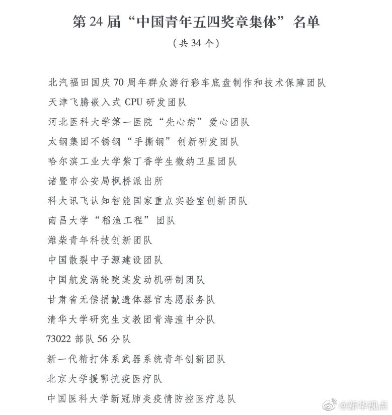 榮獲“中國青年五四獎?wù)录w”的分別是:北汽福田國慶70周年群眾游行彩車底盤制作和技術(shù)保障團(tuán)隊,天津飛騰嵌入式CPU研發(fā)團(tuán)隊,河北醫(yī)科大學(xué)第一醫(yī)院“先心病”愛心團(tuán)隊,太鋼集團(tuán)不銹鋼“手撕鋼”創(chuàng)新研發(fā)團(tuán)隊,哈爾濱工業(yè)大學(xué)紫丁香學(xué)生微納衛(wèi)星團(tuán)隊,諸暨市公安局楓橋派出所,科大訊飛認(rèn)知智能國家重點(diǎn)實(shí)驗(yàn)室創(chuàng)新團(tuán)隊,南昌大學(xué)“稻漁工程”團(tuán)隊,濰柴青年科技創(chuàng)新團(tuán)隊,中國散裂中子源建設(shè)團(tuán)隊,中國航發(fā)渦輪院某發(fā)動機(jī)研制團(tuán)隊,甘肅省無償捐獻(xiàn)遺體器官志愿服務(wù)隊,清華大學(xué)研究生支教團(tuán)青海湟中分隊,73022部隊56分隊,新一代精打體系武器系統(tǒng)青年創(chuàng)新團(tuán)隊,北京大學(xué)援鄂抗疫醫(yī)療隊,中國醫(yī)科大學(xué)新冠肺炎疫情防控醫(yī)療總隊,吉林大學(xué)第一醫(yī)院重癥救治醫(yī)療隊,南京醫(yī)科大學(xué)第一附屬醫(yī)院(江蘇省人民醫(yī)院)援武漢重癥醫(yī)療隊,浙江大學(xué)醫(yī)學(xué)院附屬第一醫(yī)院新冠肺炎救治青年突擊隊,山東省疾控中心援助黃岡“齊魯青鋒”機(jī)動隊,華中科技大學(xué)同濟(jì)醫(yī)學(xué)院附屬協(xié)和醫(yī)院發(fā)熱門診團(tuán)隊,湖北省第三人民醫(yī)院耳鼻喉科(核酸拭子采樣)團(tuán)隊,湖北卓爾公益基金會,中南大學(xué)湘雅醫(yī)院重癥醫(yī)學(xué)科,四川大學(xué)華西醫(yī)院援鄂青年突擊隊,中部戰(zhàn)區(qū)總醫(yī)院感染科,中日友好醫(yī)院援鄂抗疫醫(yī)療隊,中國建筑三局武漢火神山、雷神山醫(yī)院建設(shè)團(tuán)隊,京東物流武漢亞一城配青年車隊,中國航天科技集團(tuán)有限公司第一研究院二一一廠長征五號運(yùn)載火箭總裝測試團(tuán)隊,中國船舶集團(tuán)有限公司第七〇一研究所首艘國產(chǎn)航母某關(guān)鍵系統(tǒng)系泊航行試驗(yàn)隊,中國航空工業(yè)集團(tuán)有限公司新型戰(zhàn)機(jī)換發(fā)技術(shù)攻關(guān)團(tuán)隊,中國航空發(fā)動機(jī)集團(tuán)有限公司某新型發(fā)動機(jī)研制團(tuán)隊。