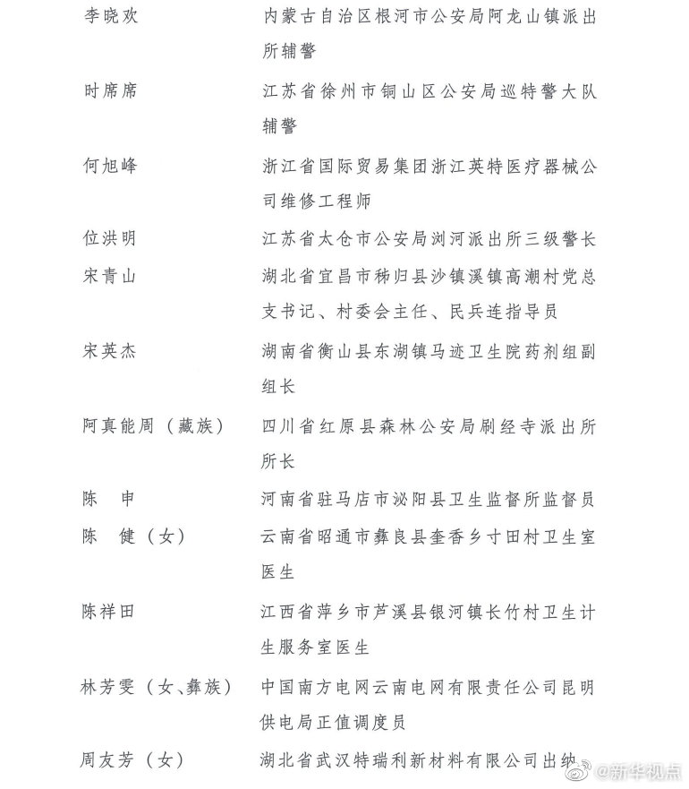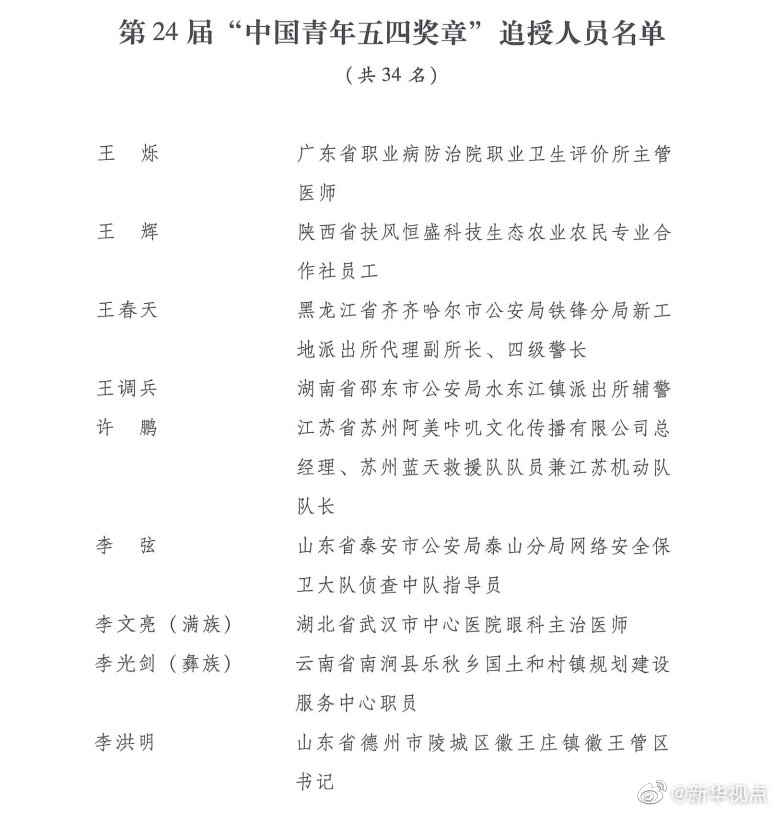 第24屆“中國青年五四獎?wù)隆弊肥谌藛T分別是:廣東省職業(yè)病防治院職業(yè)衛(wèi)生評價所主管醫(yī)師王爍,陜西省扶風(fēng)恒盛科技生態(tài)農(nóng)業(yè)農(nóng)民專業(yè)合作社員工王輝,黑龍江省齊齊哈爾市公安局鐵鋒分局新工地派出所代理副所長、四級警長王春天,湖南省邵東市公安局水東江鎮(zhèn)派出所輔警王調(diào)兵,江蘇省蘇州阿美咔嘰文化傳播有限公司總經(jīng)理、蘇州藍(lán)天救援隊隊員兼江蘇機(jī)動隊隊長許鵬,山東省泰安市公安局泰山分局網(wǎng)絡(luò)安全保衛(wèi)大隊偵查中隊指導(dǎo)員李弦,湖北省武漢市中心醫(yī)院眼科主治醫(yī)師李文亮(滿族),云南省南澗縣樂秋鄉(xiāng)國土和村鎮(zhèn)規(guī)劃建設(shè)服務(wù)中心職員李光劍(彝族),山東省德州市陵城區(qū)徽王莊鎮(zhèn)徽王管區(qū)書記李洪明,內(nèi)蒙古自治區(qū)根河市公安局阿龍山鎮(zhèn)派出所輔警李曉歡,江蘇省徐州市銅山區(qū)公安局巡特警大隊輔警時席席,浙江省國際貿(mào)易集團(tuán)浙江英特醫(yī)療器械公司維修工程師何旭峰,江蘇省太倉市公安局瀏河派出所三級警長位洪明,湖北省宜昌市秭歸縣沙鎮(zhèn)溪鎮(zhèn)高潮村黨總支書記、村委會主任、民兵連指導(dǎo)員宋青山,湖南省衡山縣東湖鎮(zhèn)馬跡衛(wèi)生院藥劑組副組長宋英杰,四川省紅原縣森林公安局刷經(jīng)寺派出所所長阿真能周(藏族),河南省駐馬店市泌陽縣衛(wèi)生監(jiān)督所監(jiān)督員陳申,云南省昭通市彝良縣奎香鄉(xiāng)寸田村衛(wèi)生室醫(yī)生陳?。ㄅ魇∑监l(xiāng)市蘆溪縣銀河鎮(zhèn)長竹村衛(wèi)生計生服務(wù)室醫(yī)生陳祥田,中國南方電網(wǎng)云南電網(wǎng)有限責(zé)任公司昆明供電局正值調(diào)度員林芳雯(女、彝族),湖北省武漢特瑞利新材料有限公司出納周友芳(女),安徽省銅陵市樅陽縣公安局特(巡)警大隊輔警一中隊副隊長胡鋒,四川省甘孜藏族自治州得榮縣龍絨寺寺廟管理委員會主任洛絨益西(藏族),四川省廣元經(jīng)開區(qū)盤龍鎮(zhèn)深溝村村民宮高明,江蘇省南京市公安局高淳分局淳溪派出所輔警袁劍雄,山東省泰安市岱岳區(qū)角峪鎮(zhèn)先鋒村村民賈慶臣,湖北省武漢市蔡甸區(qū)人民醫(yī)院住院醫(yī)師夏思思(女),江蘇省南京市公安局行政審批服務(wù)處網(wǎng)絡(luò)政務(wù)科一級警員徐昊,江蘇省徐州市沛縣公安局五段派出所輔警章良志,湖北省武漢市江夏區(qū)第一人民醫(yī)院醫(yī)師彭銀華,廣東省英德市公安局橋頭派出所輔警曾文聰,江西省蓮花縣湖上鄉(xiāng)中心衛(wèi)生院醫(yī)生熊波,河南省鄭州市公安局東風(fēng)路分局治安管理服務(wù)大隊三中隊民警、四級警長樊樹鋒,甘肅省舟曲縣扶貧辦副主任張小娟(女、藏族)。