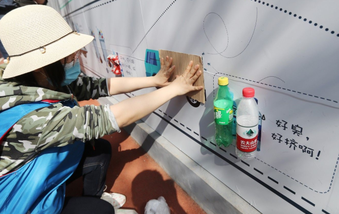 4月28日,“家園衛(wèi)士 分類先行”垃圾分類主題活動(dòng)在東城區(qū)建國門街道舉行,社區(qū)工作人員和居民將消毒的瓶蓋、易拉罐等生活垃圾粘貼在墻面上的相應(yīng)位置。攝影/新京報(bào)記者 王貴彬