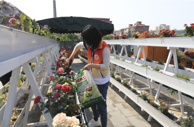 4月27日,海淀區(qū)學(xué)院路街道二里莊社區(qū),“廚余垃圾資源化一體機(jī)”轉(zhuǎn)化出來的營養(yǎng)土經(jīng)過晾曬后,用于屋頂花園的花草種植。攝影/新京報(bào)記者 浦峰