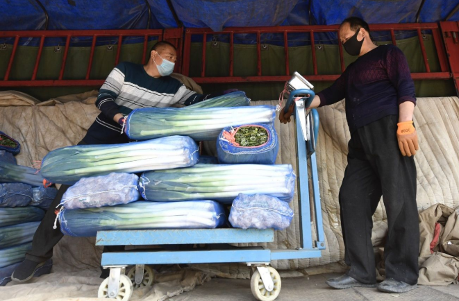4月13日,新發(fā)地市場,批發(fā)商正在對來自上海的凈蔥進(jìn)行過秤。為實(shí)現(xiàn)垃圾減量,新發(fā)地鼓勵(lì)商戶“凈菜進(jìn)京”,大蔥、洋蔥等“主菜”在產(chǎn)地裝車時(shí),就去掉了多余部分。