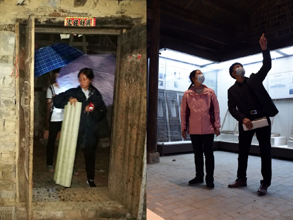 ?。ㄗ髨D:2017年7月的一場大暴雨中,大灣村第一書記余靜轉移危房中群眾,新華社記者陳諾攝;右圖:2020年3月19日,大灣村在建農俗博物館內,余靜(左)和施工人員交流。新華社發周牧攝)