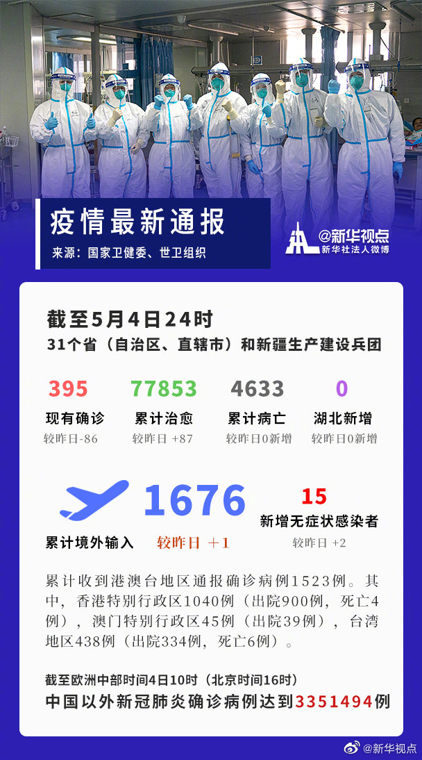 截至5月4日24時,據31個省(自治區、直轄市)和新疆生產建設兵團報告,現有確診病例395例(其中重癥病例29例),累計治愈出院病例77853例,累計死亡病例4633例,累計報告確診病例82881例,現有疑似病例2例。累計追蹤到密切接觸者735240人,尚在醫學觀察的密切接觸者7152人。
