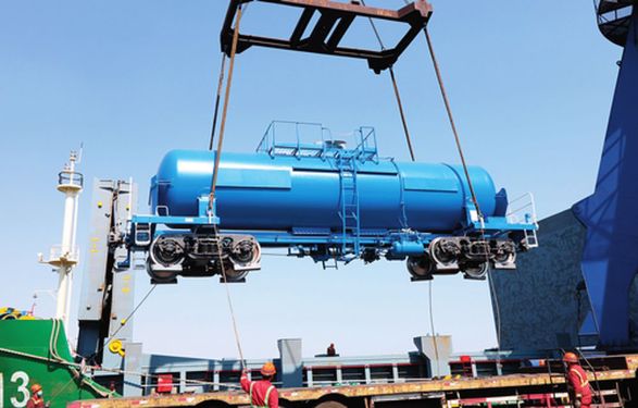 中車齊齊哈爾車輛有限公司出口韓國的濃硫酸罐車準備啟程發運(4 月 8 日攝) 宮巖攝 / 本刊