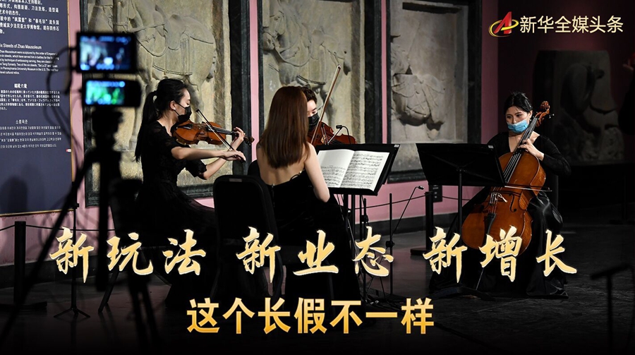 5月2日晚,通過(guò)網(wǎng)絡(luò)直播的“云上國(guó)寶”音樂(lè)會(huì)在西安碑林博物館奏響。這是4月28日,西安交響樂(lè)團(tuán)“弦上莫奈四重奏”為音樂(lè)會(huì)彩排。 新華社記者 李一博 攝