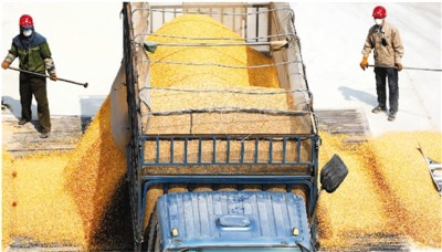 4月13日,在遼寧省鞍山市臺安縣新開河糧食儲備庫,兩名工作人員卸載剛剛收儲的玉米。新華社記者 姚劍鋒攝