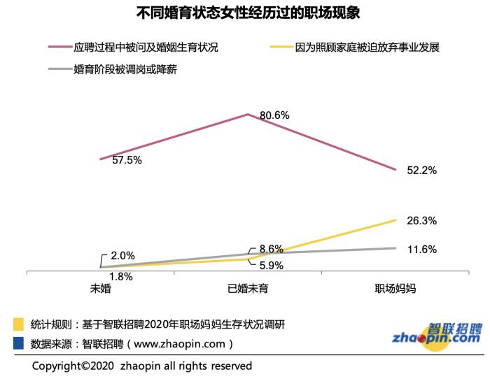 不同婚育狀態(tài)女性經(jīng)歷過的職場(chǎng)現(xiàn)象。圖片來源:《2020年職場(chǎng)媽媽生存狀況調(diào)查報(bào)告》