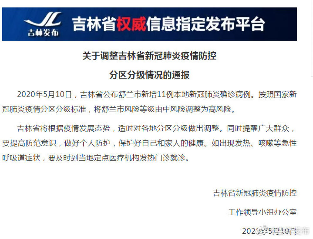 【關于調整吉林省新冠肺炎疫情防控分區分級情況的通報】2020年5月10日,吉林省公布舒蘭市新增11例本地新冠肺炎確診病例。按照國家新冠肺炎疫情分區分級標準,將舒蘭市風險等級由中風險調整為高風險。