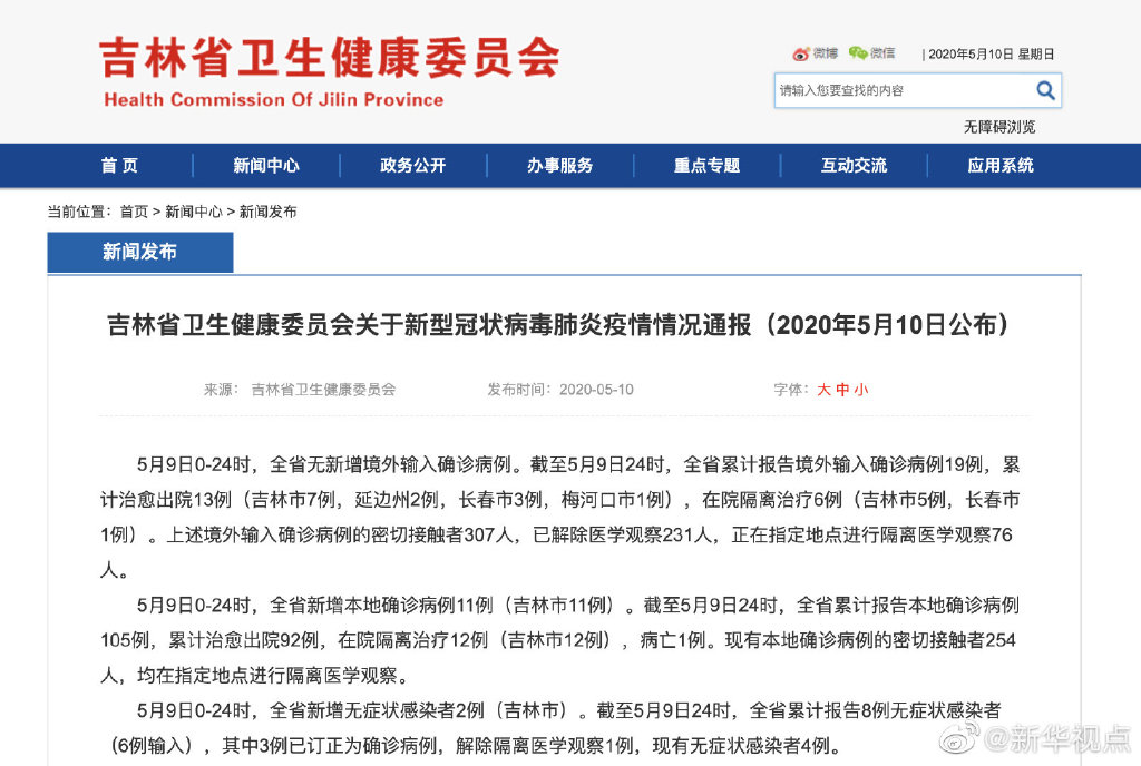 5月9日0-24時,全省新增本地確診病例11例(吉林市11例)。截至5月9日24時,全省累計報告本地確診病例105例,累計治愈出院92例,在院隔離治療12例(吉林市12例),病亡1例。現(xiàn)有本地確診病例的密切接觸者254人,均在指定地點進行隔離醫(yī)學觀察。