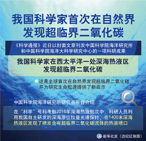 中國科學院海洋研究所研究員張鑫介紹,在“科學”號科考船2016年深海熱液航次中,科研人員利用我國自主研發的深海原位拉曼光譜探針,在1400米深海熱液區發現了噴發含有超臨界二氧化碳流體的熱液噴口。