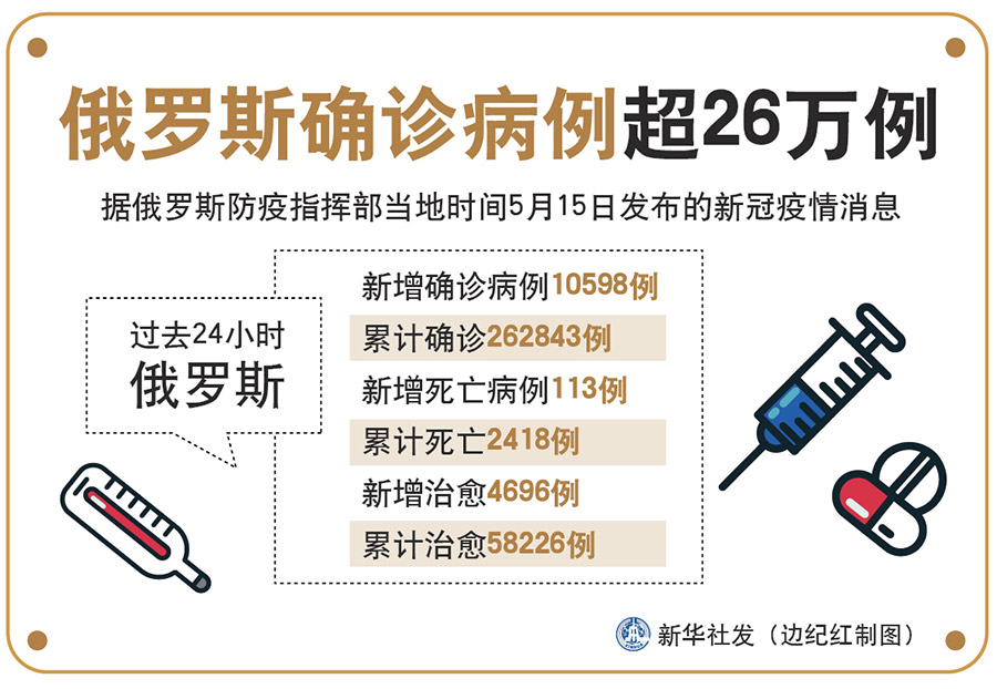 新華社莫斯科5月15日電(記者魯金博)據俄羅斯防疫指揮部15日發布的新冠疫情消息,過去24小時俄新增確診病例10598例,累計確診262843例;新增死亡病例113例,累計死亡2418例;新增治愈4696例,累計治愈58226例。
